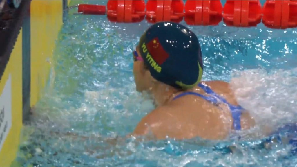 此时处在第4泳道的陈俊儿,面临第3和第5泳道的夹击之势,200米蝶泳的后半程逆转的名场面似乎又将上演。